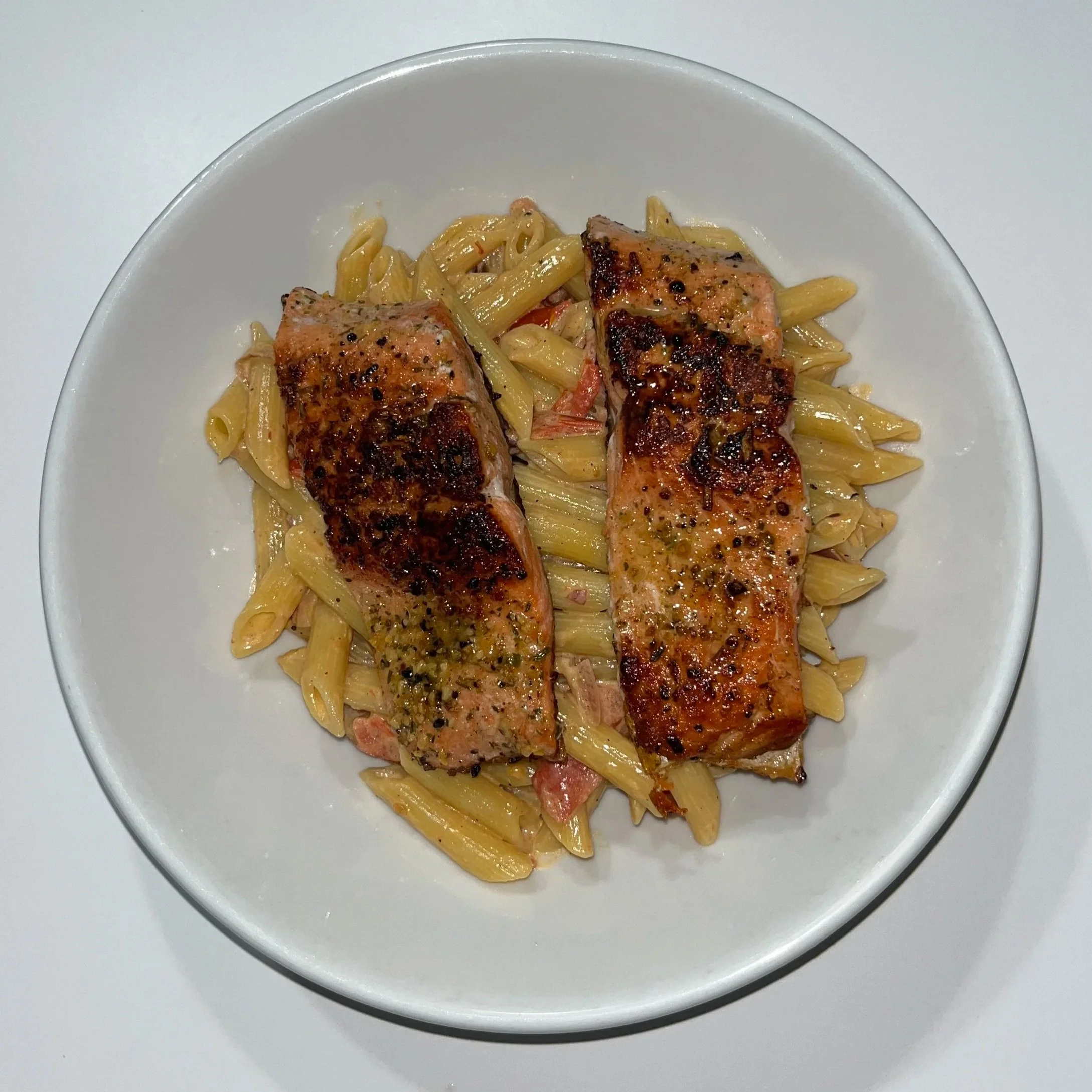 Bring a pot of well-salted water to a boil. Cook the penne until al dente according to package instructions. Reserve ¼ cup of pasta water, then drain and set aside.Season the Salmon