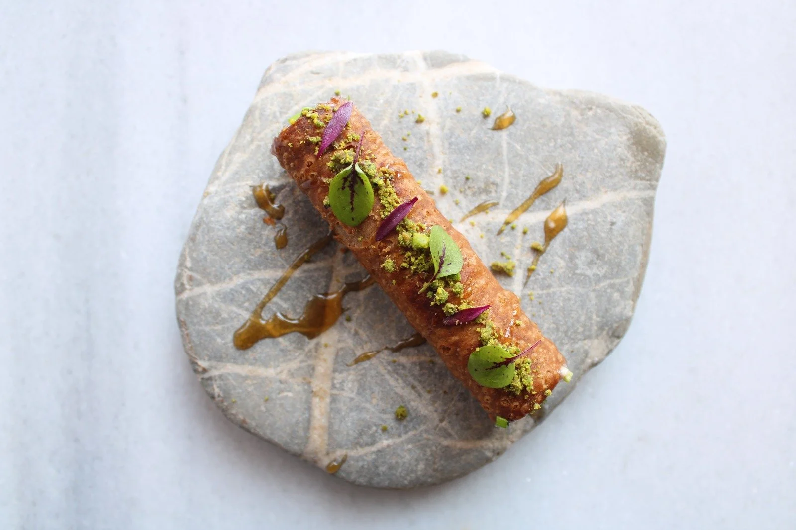 The refined Italian cannoli form is reimagined as a savory creation filled with Anatolian cheeses and pastirma. The contrast between sweet and savory brings past and present together on one plate.
